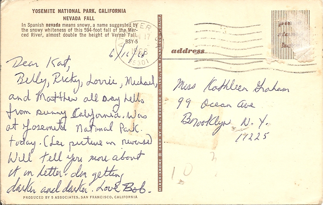“Dear Kat, Billy, Ricki, Lorrie, Michael and Matthew all say hello from sunny California. Was at Yosemite National Park today. (see picture on reverse). Will tell you all about it in a letter. I’m getting darker and darker. Love Bob” I never did find a letter. I guess I wasn’t a very good writer.