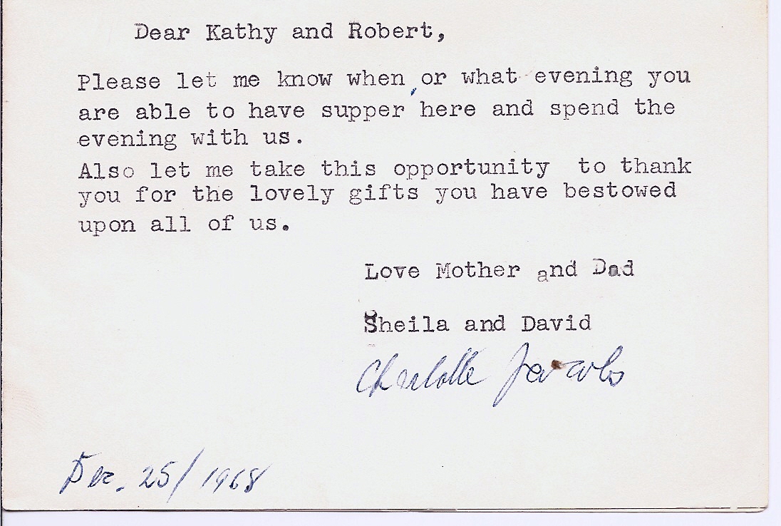 Kat and I got a big kick from that note. That is probably the only time mom ever used the word bestowed in a letter or even in a sentence. We visited them on the weekend following Christmas and after that we would see them almost every weekend. Kat loved to visit my family. Her love of family embraced us all. My mom was a terrific cook and Kat enjoyed her cooking. She became very good friends with my sister, Sheila and she always had a wonderful rapport with my dad. It did not take much for Kat and my parents to love each other.